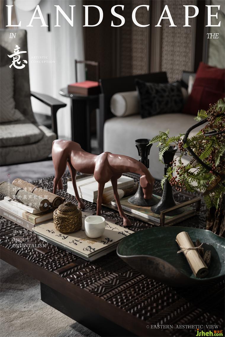 中式畫幅為景,透出連綿遠(yuǎn)山形;樣板房設(shè)計工藝精巧的木質(zhì)茶幾配以雕刻圓潤的棕紅木馬,長沙樣板間設(shè)計為休憩場域注入趣意的同時,亦透出東方式的藝術(shù)與美學(xué)。