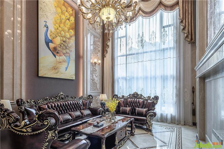 材質(zhì)運(yùn)用上,同色系軟包背景墻銜接大面積的石材墻面,延展空間尺度的同時(shí),充滿轉(zhuǎn)折的美感。深褐色的沙發(fā)擺放在一幅孔雀掛畫(huà)前,整個(gè)空間的色彩層次豐富明朗。
