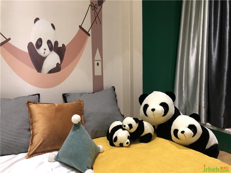 兒童房將童趣進行到底,可愛的熊抱玩偶與功夫熊抱擺件,還有墻上的熊貓裝飾畫,讓整個樣板房設計房間充滿萌趣。黃與綠的大膽撞色,營造出童話般的小小世界。