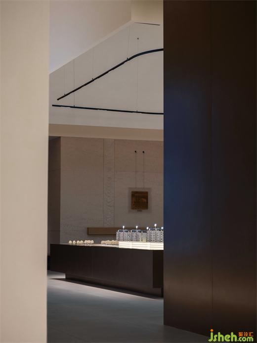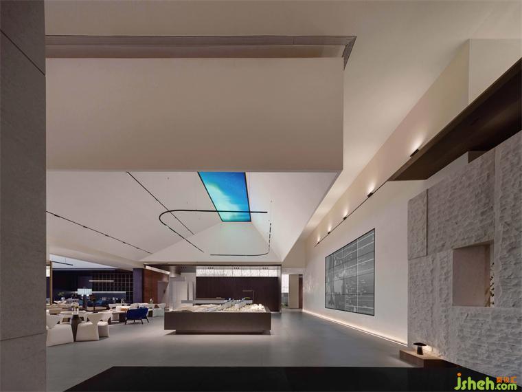 沙盤區(qū)頂部采用茅屋的梯形結(jié)構(gòu),模擬鏤空效果,體現(xiàn)出傳統(tǒng)建筑的美學(xué)特點(diǎn),讓空間結(jié)構(gòu)看起來(lái)更加輕盈和自由。銷售中心設(shè)計(jì)垂落的燈帶豐富空間的層次感,不再局限于傳統(tǒng)售樓處的展示模式,而是以一種更為靈活且富有創(chuàng)意的方式呈現(xiàn)。