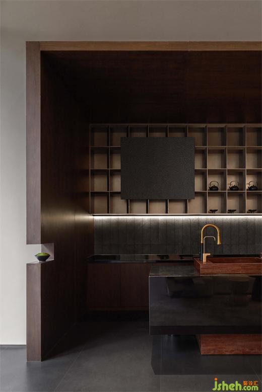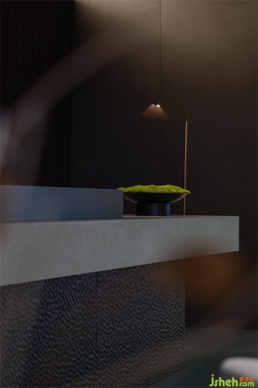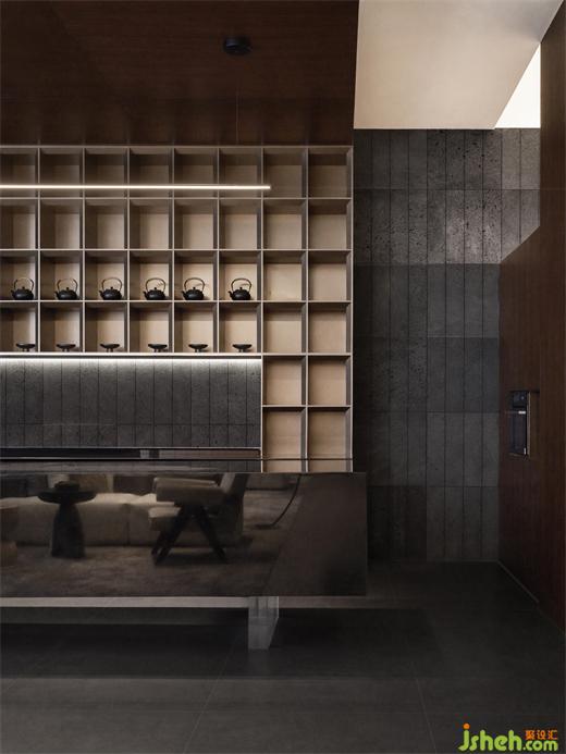 水吧臺(tái)處,茶道與品茗文化彌漫其中,營(yíng)造“竹下忘言對(duì)紫茶,全勝羽客醉流霞”的風(fēng)雅氛圍,構(gòu)建出以姑蘇在地文化為基礎(chǔ)的獨(dú)特場(chǎng)域,融入現(xiàn)代審美觀念,使整個(gè)空間彌漫著東方韻味。深沉色調(diào)的水吧臺(tái)搭配井字格陳列柜,在滿足功能性的同時(shí),也為人們營(yíng)造了一個(gè)品味生活、體驗(yàn)藝術(shù)的空間。