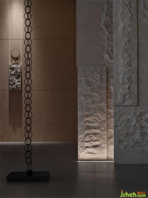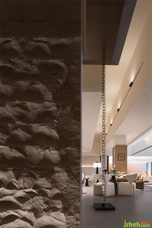 柔軟舒適的皮質(zhì)沙發(fā),伴隨著悠揚(yáng)的音樂(lè),讓人感受到一種愜意的生活節(jié)奏。一側(cè)的藝術(shù)裝置采用質(zhì)感鮮明的巖石板,自然舒展的紋理,仿佛在訴說(shuō)著歲月的滄桑和空間的無(wú)限寬廣。