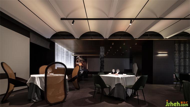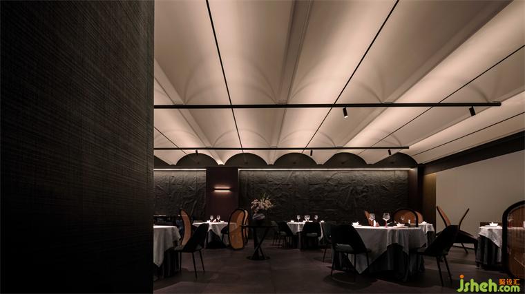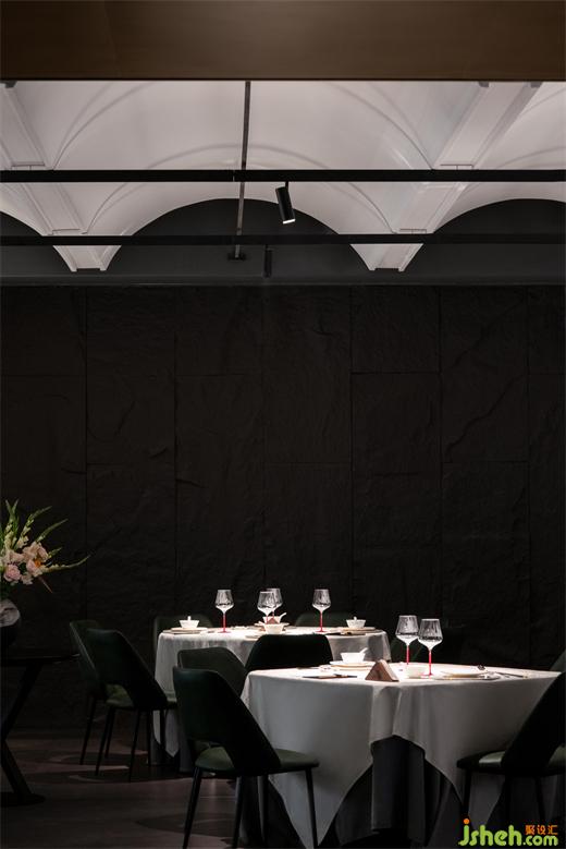 粵餐館設計開放的公共用餐區(qū)和包廂區(qū)在中廳處兩側(cè)分流,兩個區(qū)域間保持了一定的距離感?;诮ㄖ臻g的基礎,在南側(cè)的采光面設置包廂,在進入包廂前的廊道內(nèi)刻意做了流線的轉(zhuǎn)換,巧妙地在轉(zhuǎn)換點位上布置藝術裝置,喚起人們對形態(tài)美學和材質(zhì)美學的重新審視。