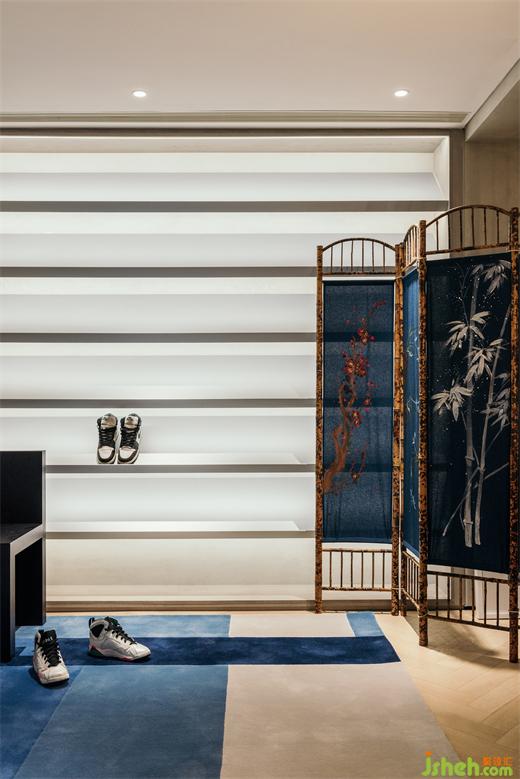 A bamboo screen from the 1980s is placed at the junction of the sneaker display area and the bathroom, which contradicts and but units with the modern carpet, providing a certain sense of security in an enclosure form while balancing the overall style.