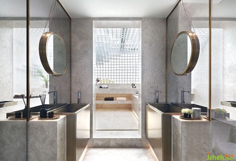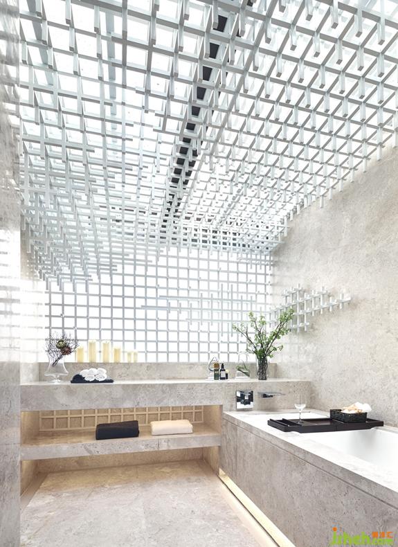 主臥浴室的天花墻面是白色烤漆木條柵格組合的網(wǎng)狀結(jié)構(gòu)造型,透過陽(yáng)光,宛若白云朵,光影隨著時(shí)間的變化不斷呈現(xiàn)夢(mèng)幻的感覺。浴缸,臺(tái)面和地面均采用冰河灰大理石,簡(jiǎn)潔又統(tǒng)一。德國(guó)Hansgrohe獨(dú)立浴缸龍頭、恒溫明裝淋浴管,金宮銅的定制黃銅衛(wèi)生間臺(tái)盆,漢斯格雅的面盆龍頭和TOTO智能馬桶,盡顯高檔生活品質(zhì)。