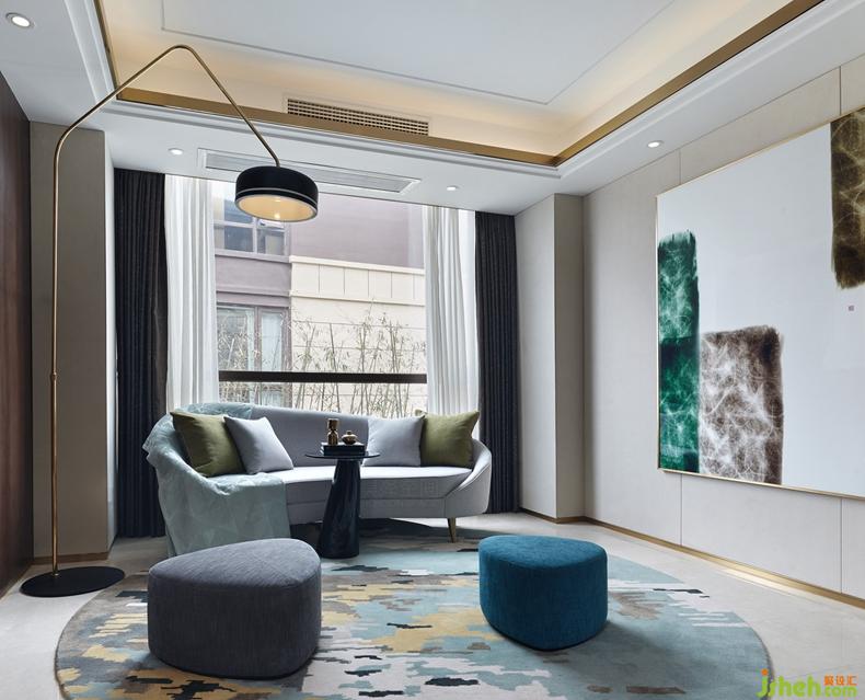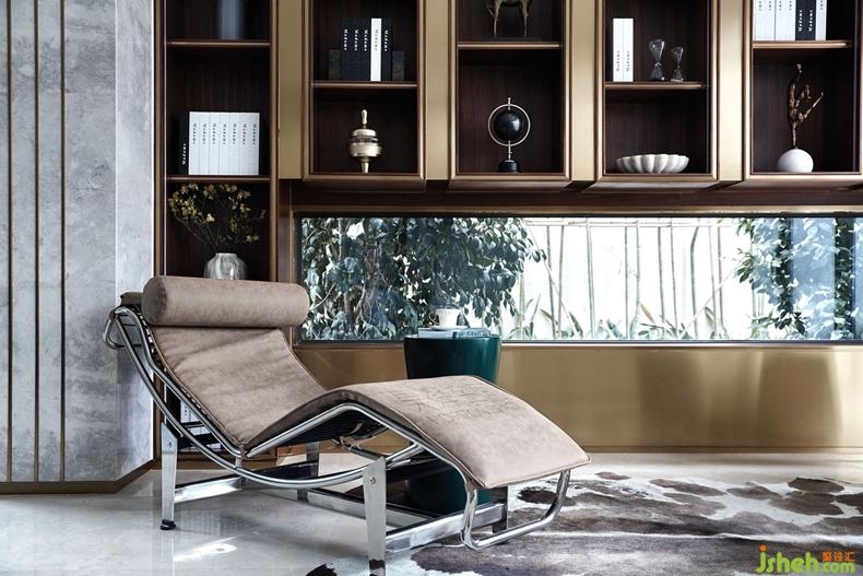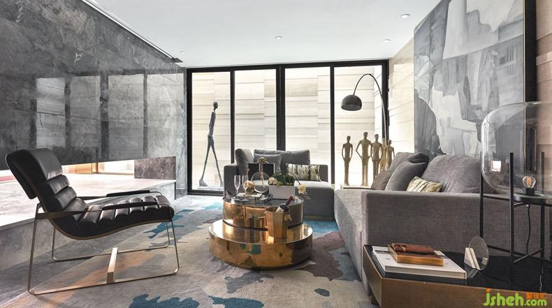 負(fù)一層的家庭影院,是和家人共享的休閑空間?,F(xiàn)代感十足的落地?zé)?,茶幾,沙發(fā)組合與賈科梅蒂的雕塑“行走的人”相得益彰。夾法莎膜茶色玻璃做的酒窖透過燈光,流光溢彩。懸挑的海貝灰大理石墻面,結(jié)合沙發(fā)背景墻和天井墻面的錯(cuò)拼法國(guó)木紋大理石,使整個(gè)空間顯得沉穩(wěn)大氣。