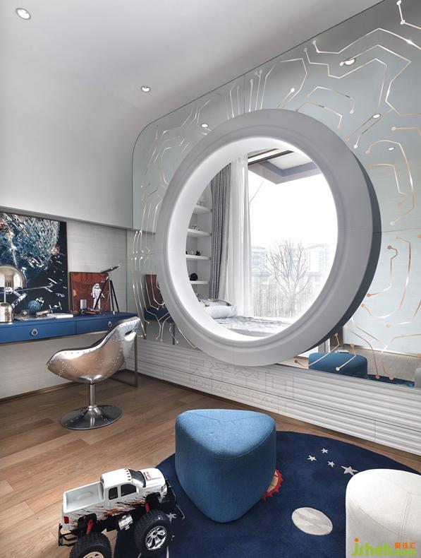 男孩房是太空主題,純凈的白色代表了未來的科技感。太空船艙式的床滿足了男孩子對(duì)宇宙探索的好奇心。女兒房則定位為學(xué)習(xí)舞蹈的少女的閨房,色調(diào)淡雅,氣氛溫馨。高檔手工織物的床品,舒適和質(zhì)感同在。