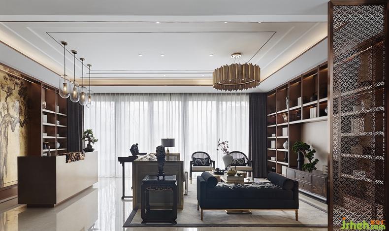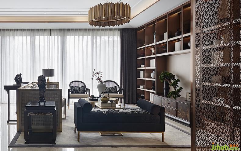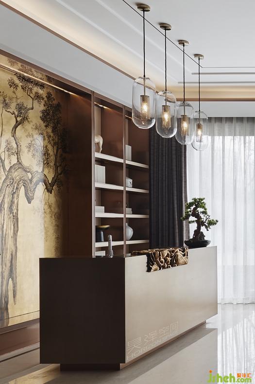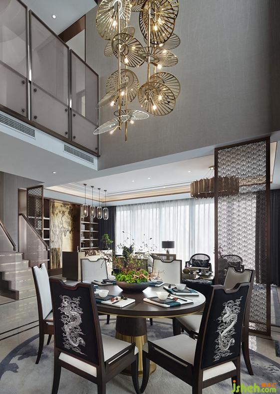 客廳布局方正,開闊明亮,全景落地窗將景色最大限度地納入空間,成為客廳中最搶眼的取景框。傳統(tǒng)的案幾,玲瓏的太湖石,李華弋的金箔畫,隨處可見的龍紋圖案等都在表達(dá)現(xiàn)代人對傳統(tǒng)、對中式的理解與體會。兩面的書柜是香檳玉大理石和拉絲古銅的完美結(jié)合,飾品精致,圖書琳瑯,營造出一種書香門第的氛圍。這樣的設(shè)計(jì)也符合業(yè)主的學(xué)識和品位。仿古銅的吧臺依靠特殊做舊工藝制造出隱隱約約的水墨圖案,又戲劇性地融合傳統(tǒng)紋樣的實(shí)木雕刻,造型新穎而獨(dú)特。抱枕和長榻的手工龍紋刺繡與電視柜的描金山水圖案互相呼應(yīng),不經(jīng)意間顯示出中式的華麗端莊。