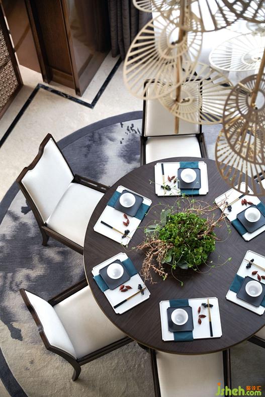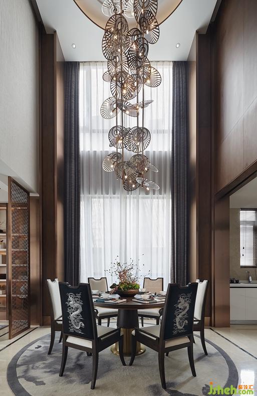 餐廳的天花運(yùn)用鏡面,使空間無限延伸,倒映出蒲扇組合的藝術(shù)裝置,仿佛是從天而降散落的花瓣,錯落有致,別有一番趣味。挑高的餐廳空間透過大窗,可以看到月光,晚霞,竹林,怪石等景色。窗的兩邊伴有金屬的琥珀壁燈在柱上留下斑駁的光影,是中國傳統(tǒng)燈籠的演化。墻面是深色的科定木飾面,低調(diào)而深沉。餐椅背板的龍紋刺繡和精選水墨地毯詮釋著中式韻味。來自德國的西門子的廚房電器設(shè)備,德國Hansgrohe的廚房抽拉式龍頭和科勒的廚房臺盆,盡顯高檔生活品質(zhì)。