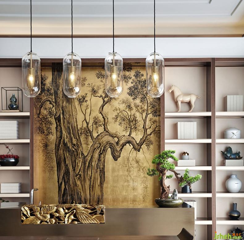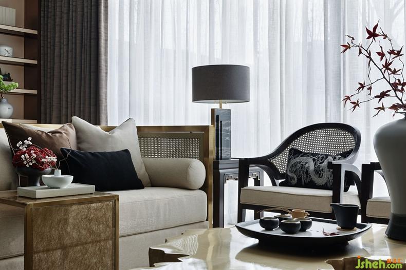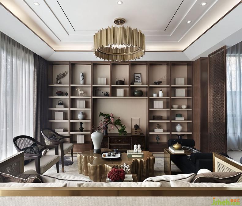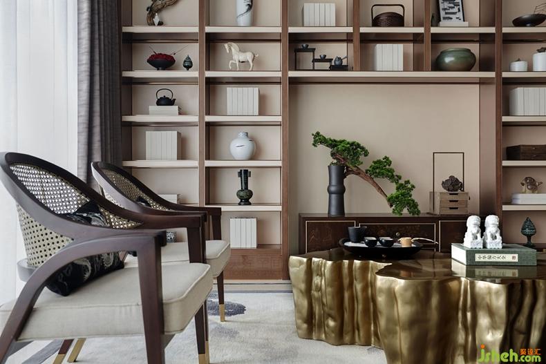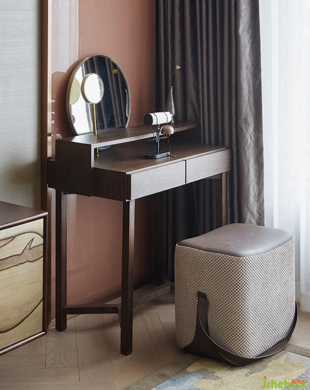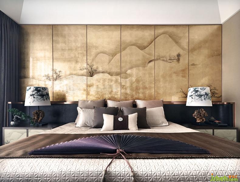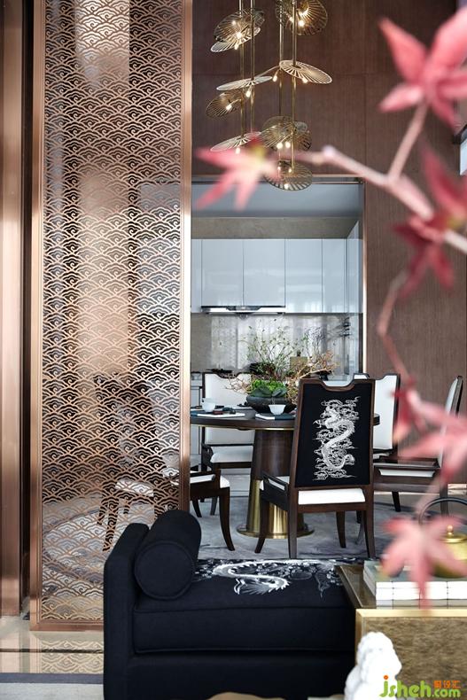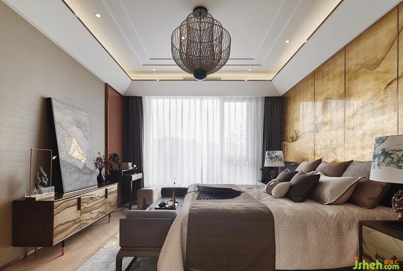 三層的主臥繼續(xù)貫穿整個(gè)格調(diào),背景墻是日本知名畫家的金箔畫,貴氣十足。橫擴(kuò)捫皮床屏圓弧倒角處理,融入包裹感和當(dāng)代功能性,用摩登手法和材質(zhì)演繹當(dāng)代中式韻味。臺(tái)燈的造型取意于太湖石,別具一格。云紋夾絲玻璃隔斷與金屬網(wǎng)狀吊燈遙相呼應(yīng)。臥室的步入式衣帽間——通透夾絲玻璃門,從而讓整個(gè)衣帽間變得通透、輕盈,在這里,衣帽間不再是乏味地吊掛著服飾,同時(shí)也是主人收藏藝術(shù)品與生活品味的角落。