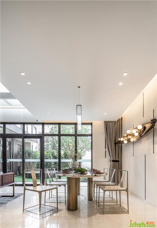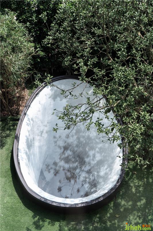“茶”作為連貫家庭、文化、以及生活的開場,前院與室內(nèi)互動,可以赤腳到草坪,緊隨的景觀池是直通地下室的采光頂。波光粼粼的水景使空間活了起來,內(nèi)部通過旋轉(zhuǎn)樓梯上來是懸挑、玻璃通透的“自在場頭”,玻璃頂?shù)臐i漪讓空間更具趣味和互動性。別墅裝飾
