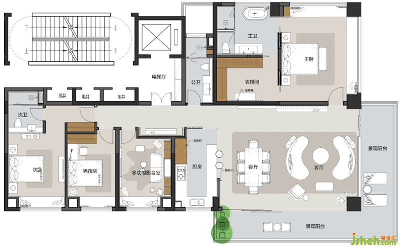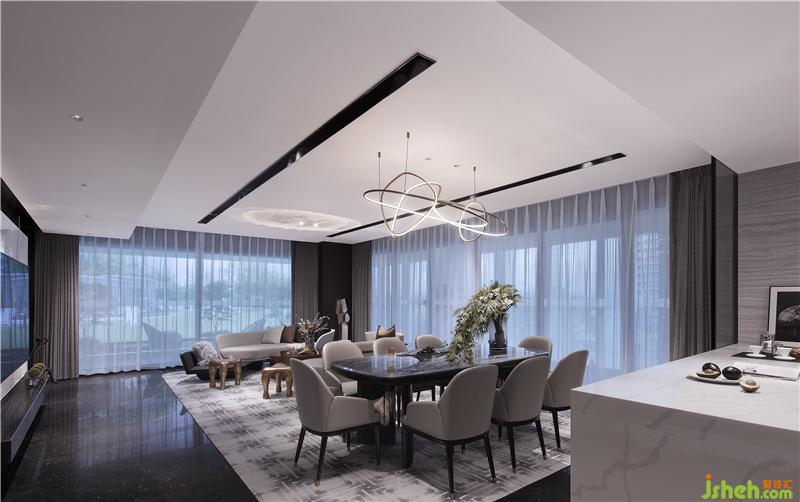 在家具選配中強(qiáng)調(diào)材質(zhì)品質(zhì)感與造型線條的流暢,以自然色與深灰色為主,其中現(xiàn)代藝術(shù)品則增添了空間更為豐富的層次與內(nèi)涵。
