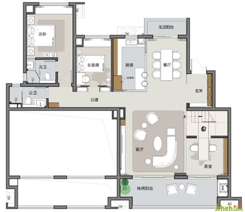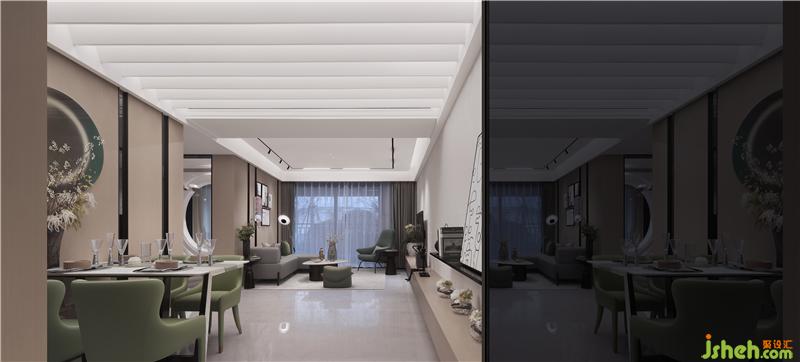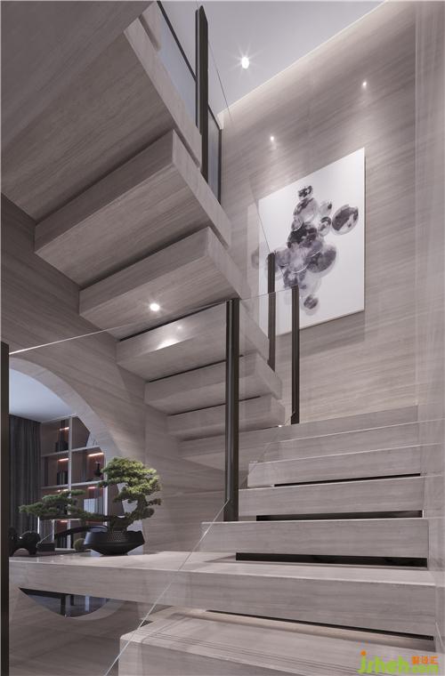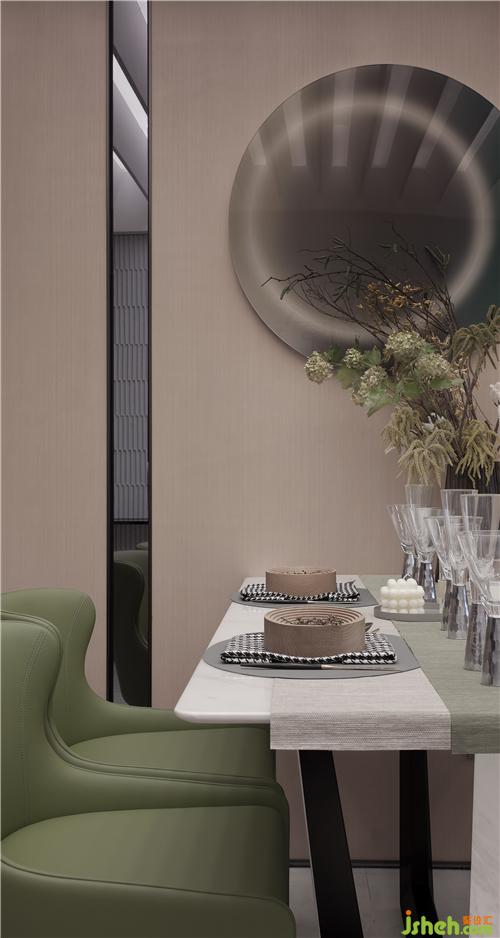 在自然的氣息中踩著輕松活力的節(jié)拍自由漫步。室內(nèi)空間使用大面積的木飾面,輔以高光通透灰色鏡面甩掉空間的壓迫感,再以明亮的綠、沉穩(wěn)的藍作為點綴之筆,刪繁就簡將自然元素融入空間之中,使整個空間生機盎然。
