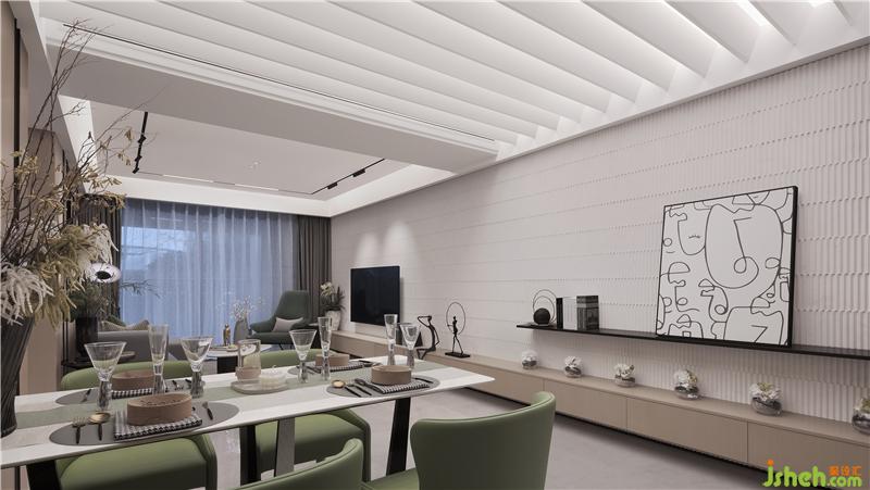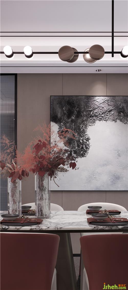客廳通透開敞,墻面上的抽象畫作與餐桌的藝術品形成空間對話,體現(xiàn)出多層次的趣味性。