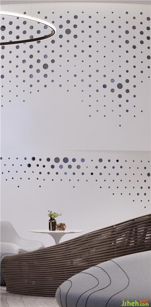 看似簡單的旋轉(zhuǎn)重復(fù),其實是在不同的維度上不停的迭代重生,所以圍繞著中心圓形的“鳳凰之眼”,售樓處設(shè)計我們營造了輕盈如飄帶般的莫比斯環(huán),每一個進入藝術(shù)中心的人在環(huán)形的空間中參觀游走時,都是圍繞著它,并且它仿佛是不停地在旋轉(zhuǎn)向上,給人很生生不息的心理體驗感。