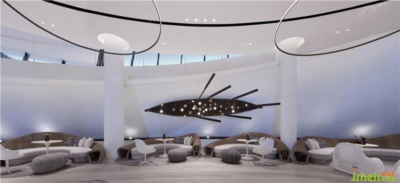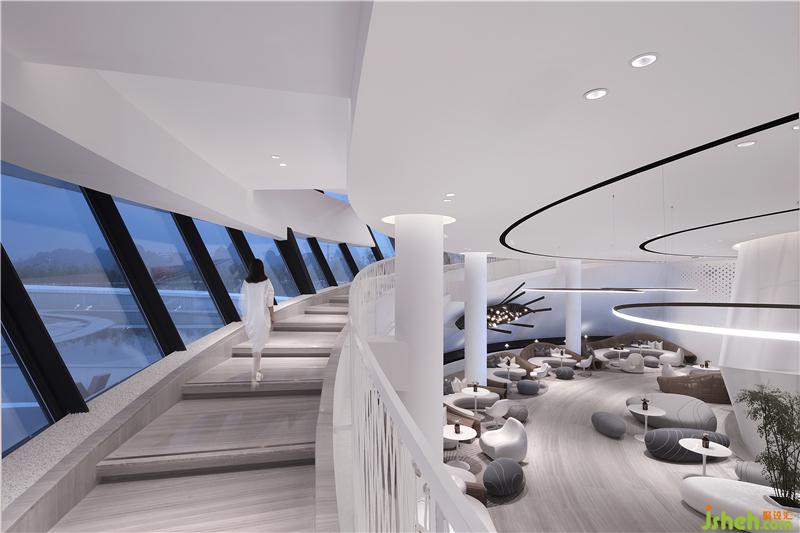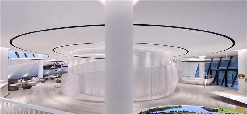 巨大的連接整個建筑上下層空間,銜接室內(nèi)空間和室外360度環(huán),陽朔山水景觀的環(huán)坡階梯,售樓處設(shè)計使參觀者拾級而上的整個過程,都能感受到充滿夢幻的喀斯特地貌景觀,并是將莫比斯環(huán)的設(shè)計邏輯在建筑上再一次宏觀重構(gòu)。