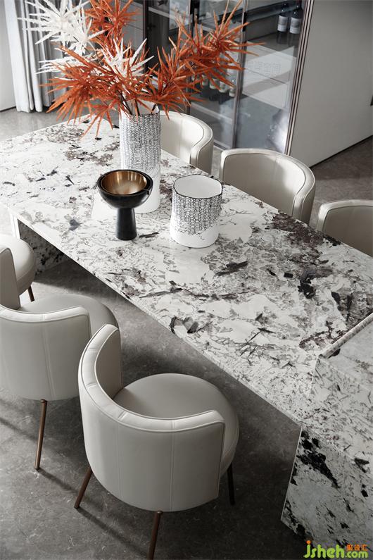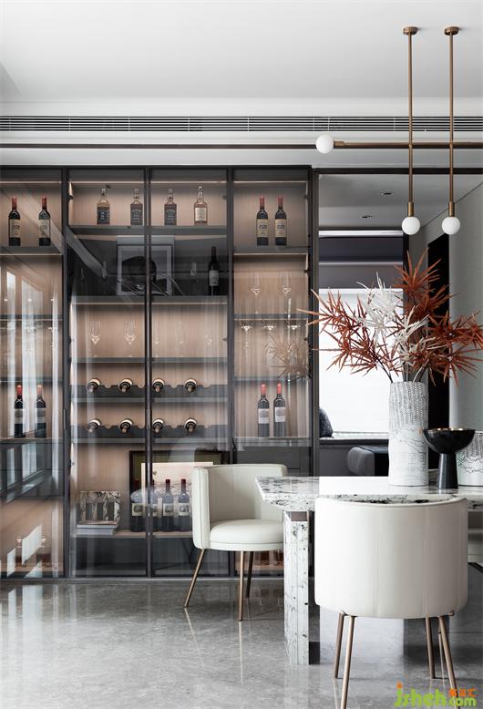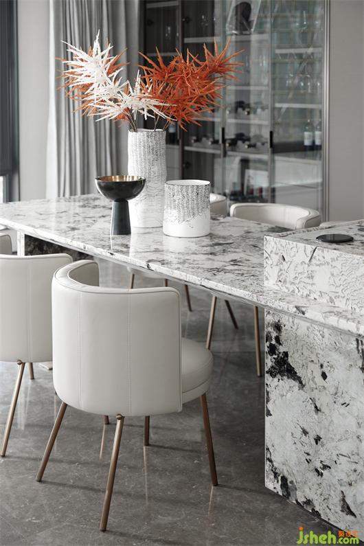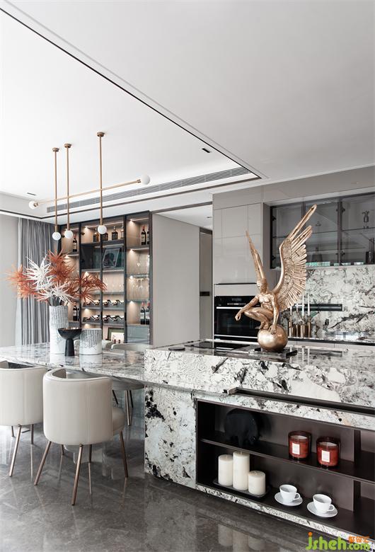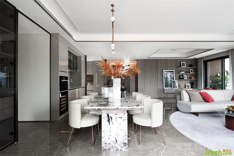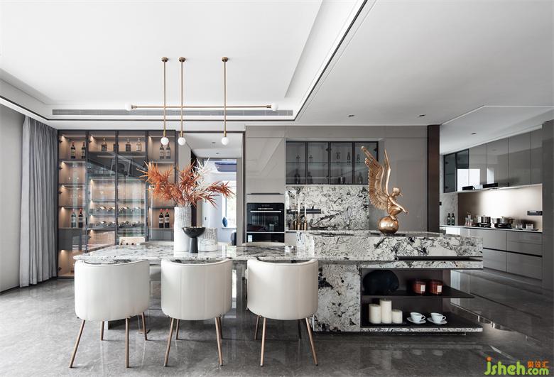 整個(gè)家庭的社交中樞:會(huì)客、就餐、廚房位于一條軸線,南北通透、動(dòng)靜分明,在“場(chǎng)域化社交”中還原家庭空間的場(chǎng)景化。大尺度公區(qū)內(nèi),安排了“會(huì)客區(qū)”、“私宴區(qū)”、“島臺(tái)區(qū)”和“奢尺烹飪區(qū)”,大方廳270°落地玻璃全景陽臺(tái),則是完美的“自定義空間區(qū)”。