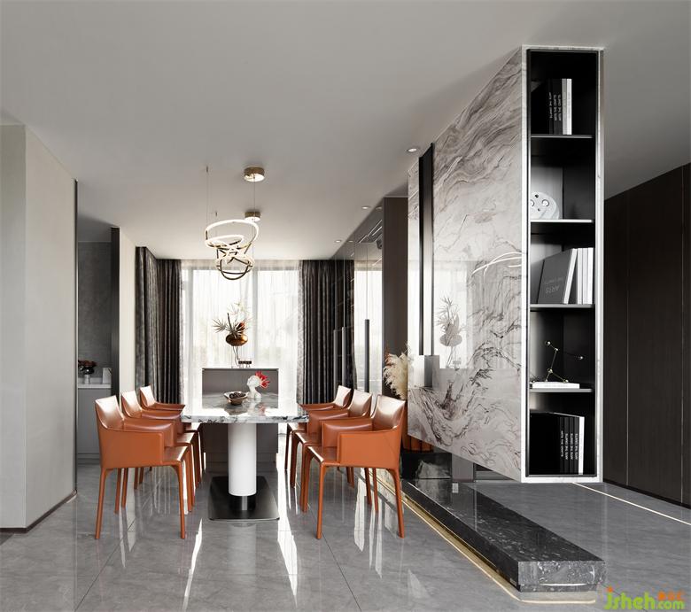 兩層超高的挑空客廳,通過最簡(jiǎn)潔的大體塊疊加的造型關(guān)系,互相組合交疊,精準(zhǔn)的比例把控和考究的色系搭配,樣板房設(shè)計(jì)彰顯個(gè)性的同時(shí)展露出對(duì)品質(zhì)與格調(diào)的不懈追求。尤以客廳的一角的單椅最為突出奪目。在以溫潤(rùn)的木色和高貴的咖色為主色調(diào)的空間里,它就是主角。獨(dú)特的造型和跳躍的色彩,點(diǎn)出我們“潮”的主題。
