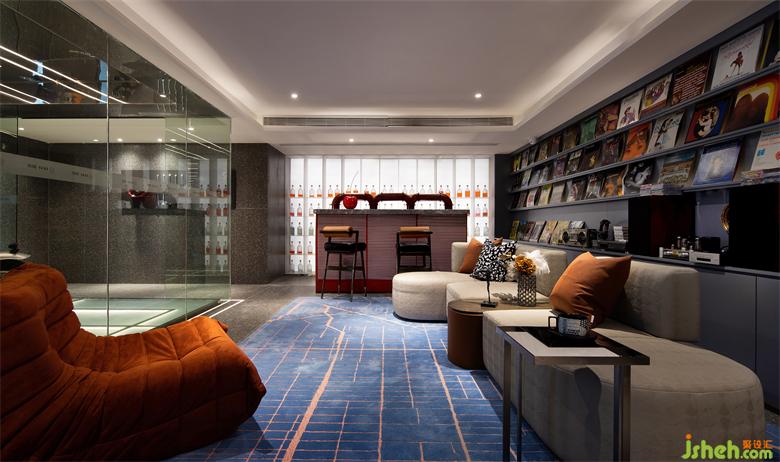 整個(gè)地下室是為男主人量身打造的興趣樂(lè)園。深色水磨石與各種鏡面材料結(jié)合,再輔以各種酷炫的燈光效果,仿若讓人置身光怪陸離的動(dòng)感吧現(xiàn)場(chǎng),如夢(mèng)似幻,又真實(shí)又迷幻??嵛冻驳墓撞Aд古_(tái),趣味十足的吧臺(tái),以及絢麗的酒架無(wú)不將“潮”發(fā)揮到極致。