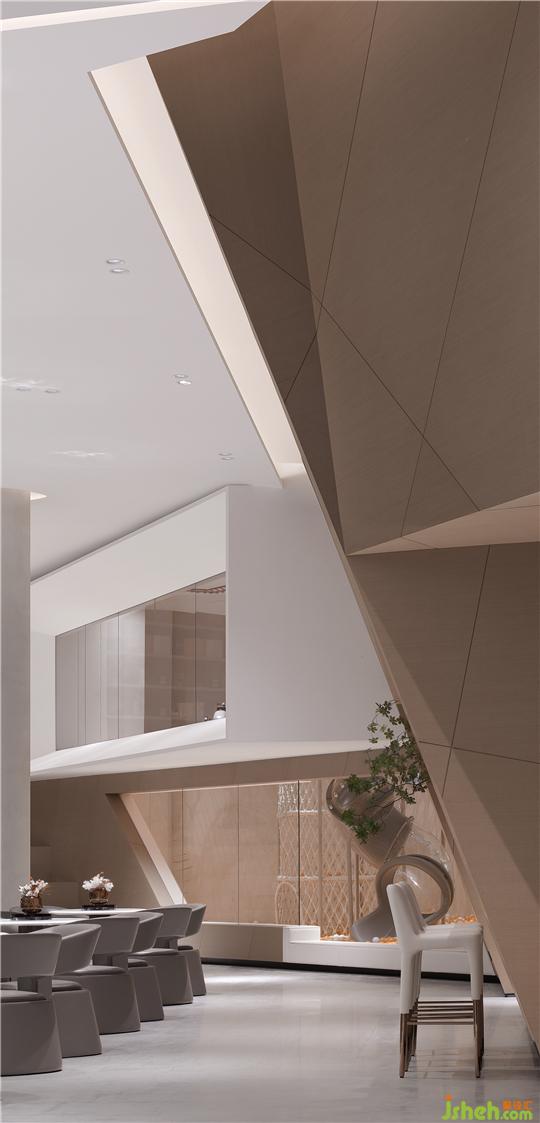 整個建筑仿佛被發(fā)掘出來的鉆石,又似乎振翅欲飛的羽翼,璀璨而輕盈,到了室內(nèi)空間,我們做的所有努力都是用嚴(yán)謹(jǐn)?shù)倪壿媽⒐δ軈^(qū)塊化,精準(zhǔn)排布位置,然后隨著建筑的勢,應(yīng)物適形。