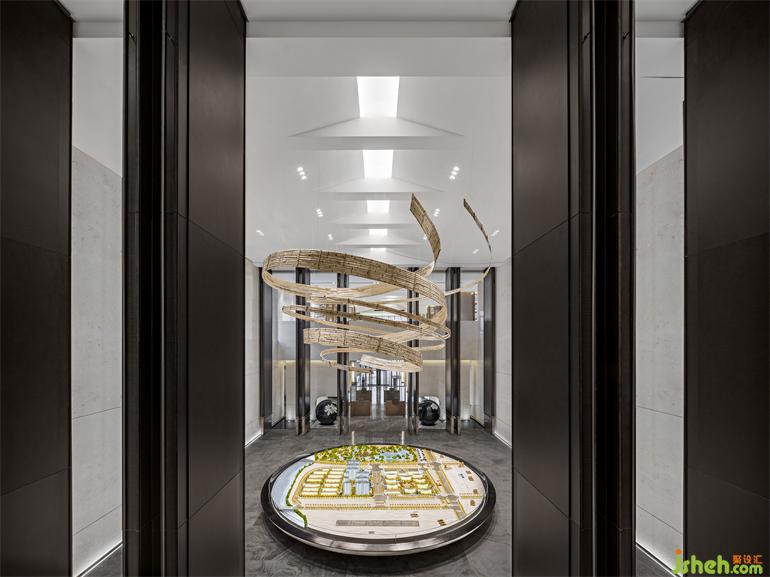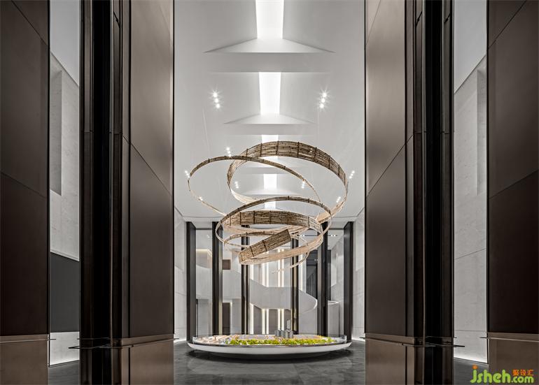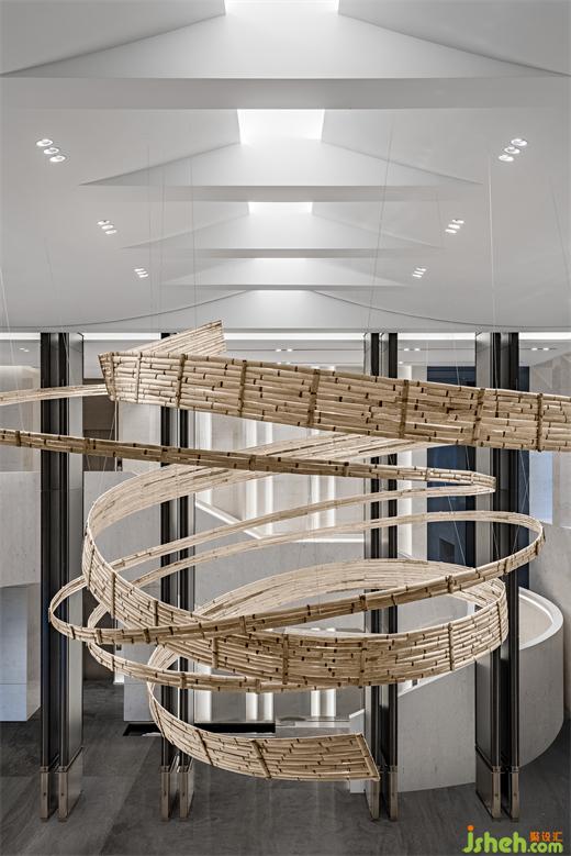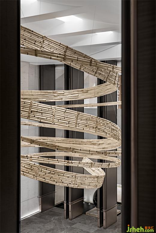 長沙售樓處設(shè)計(jì)以庭為廊,以水作徑,穿“愛晚”,越“風(fēng)雩”,便至沙盤,圓形沙盤上方懸掛的大型竹編藝術(shù)裝置—《風(fēng)來》,是邀請(qǐng)非物質(zhì)文化傳承人采用民間竹編手工傳統(tǒng)技藝耗時(shí)數(shù)月打造而成,仿若無形的空間能量在此翻滾騰躍,似云浪又似流水般在空間上方凝聚。