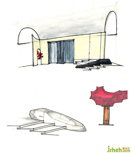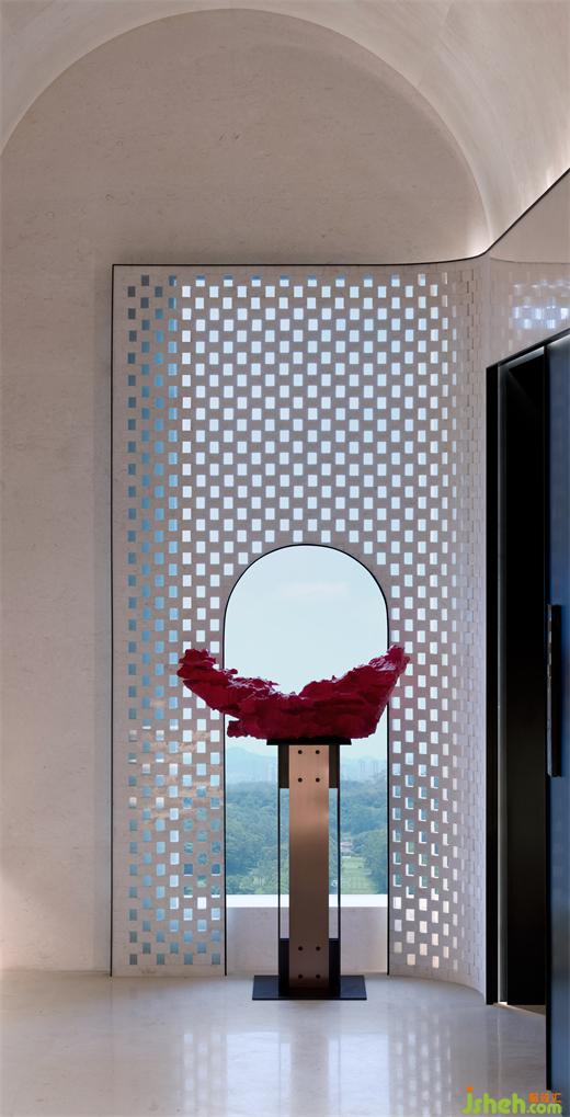 所以整個電梯空間仿佛柔軟、抽象的雙手抱護,隱喻朋友心中構(gòu)建的自我宇宙,別墅裝飾紅色湖石代表內(nèi)心中的錦繡與窗外現(xiàn)實中的山水形成對映。