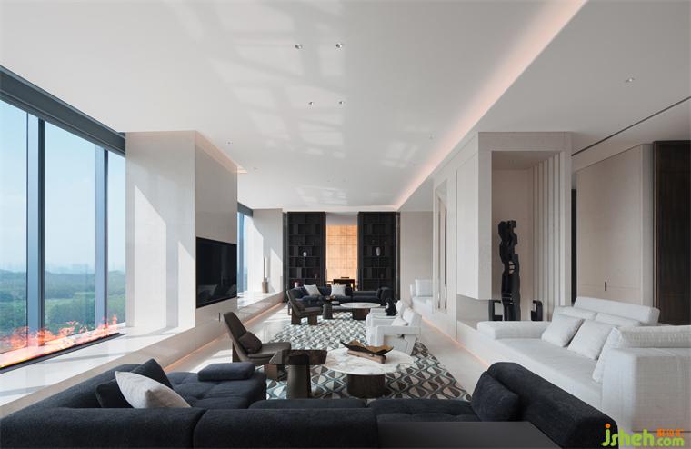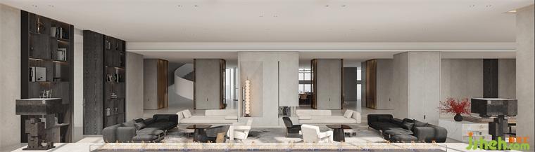 二十多米長(zhǎng)的超級(jí)會(huì)客廳被設(shè)計(jì)成階梯下沉的結(jié)構(gòu),配合同樣尺度的全景玻璃幕墻窗,別墅裝飾以俯瞰的姿態(tài)觀山閱瀾,我想在閱盡人生之后還能回歸本心是一種境界。