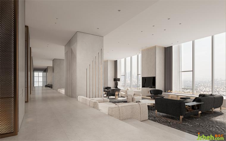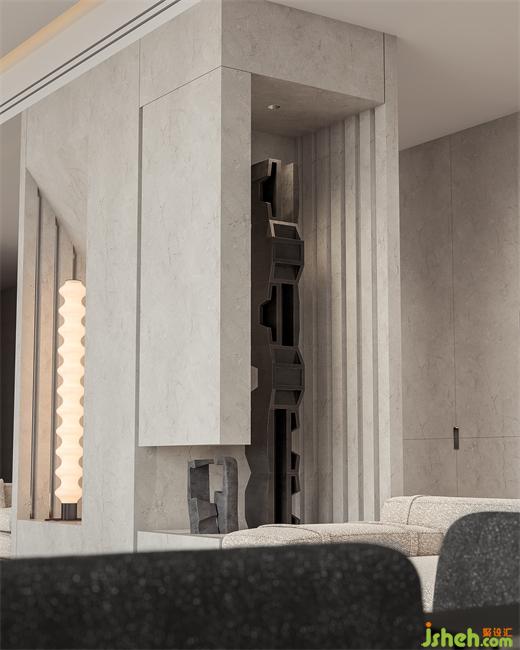 空間設(shè)計(jì)上的巧妙之處在于會(huì)客廳雖然有極具氣度的長(zhǎng)向尺度,但寬度因巨柱的位置限制而顯得拘促。走廊的抬高以及通往會(huì)客廳的臺(tái)階,別墅裝飾消解了柱子在空間中的存在,并且階梯上嵌入的沙發(fā)擴(kuò)大了會(huì)客廳的進(jìn)深,同時(shí)營(yíng)造了俯瞰的感受。