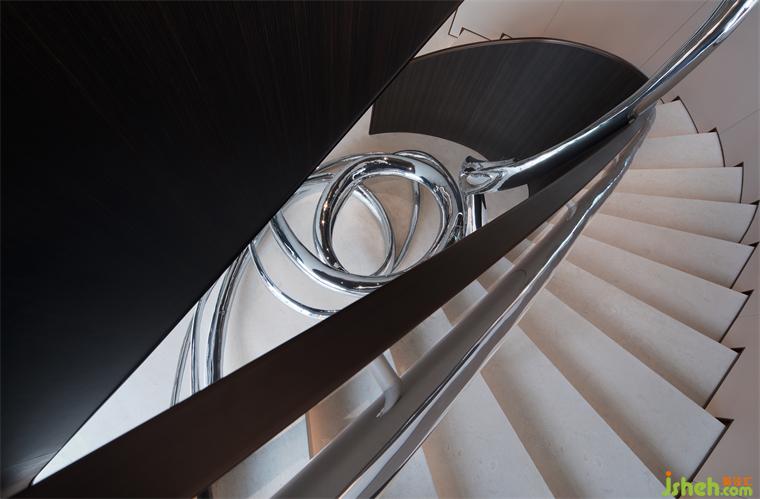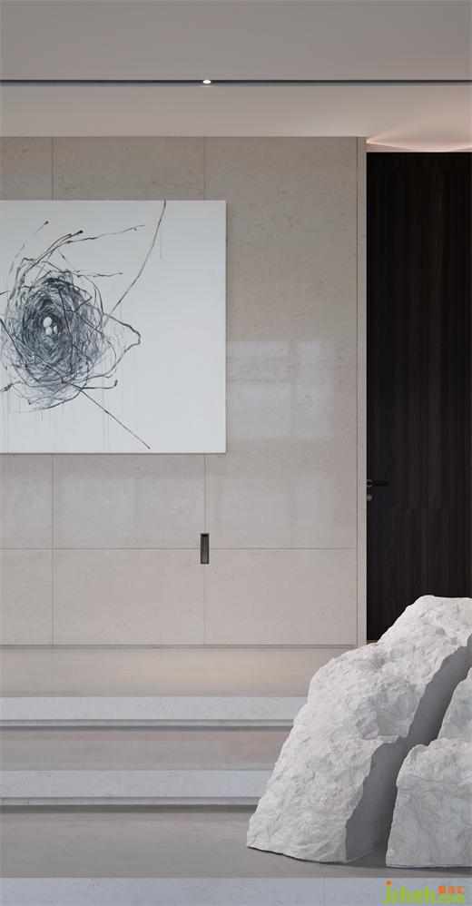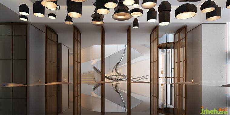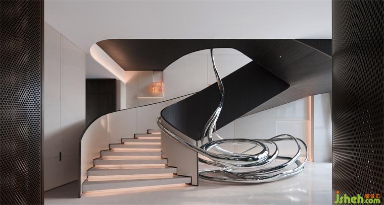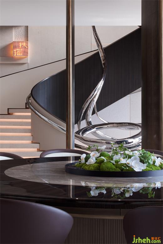 餐廳和樓梯之間用轉軸網眼銅屏風間隔,開合之間,氣象森然。別墅裝飾大型雕塑與樓梯融為一體,名扶搖,取意李白唐詩-大鵬一日同風起,扶搖直上九萬里。我問朋友,消隱于市是一和恒持的心境,待機扶搖也是吧?朋友笑而不語。