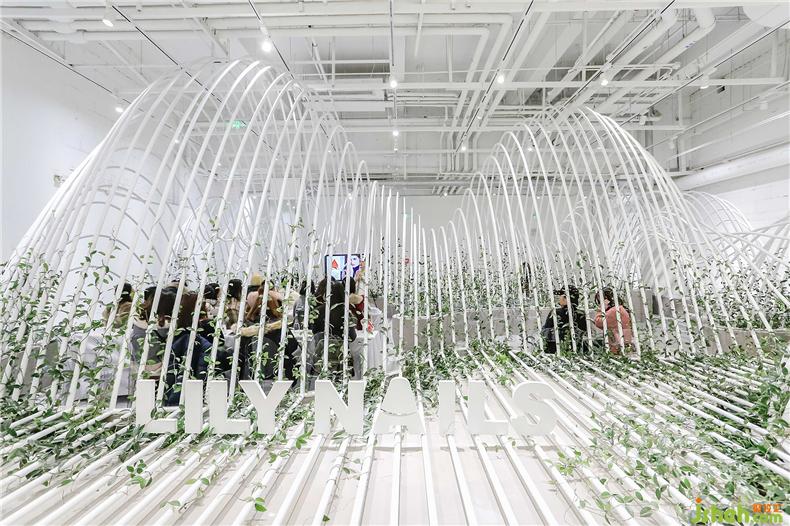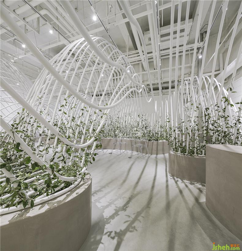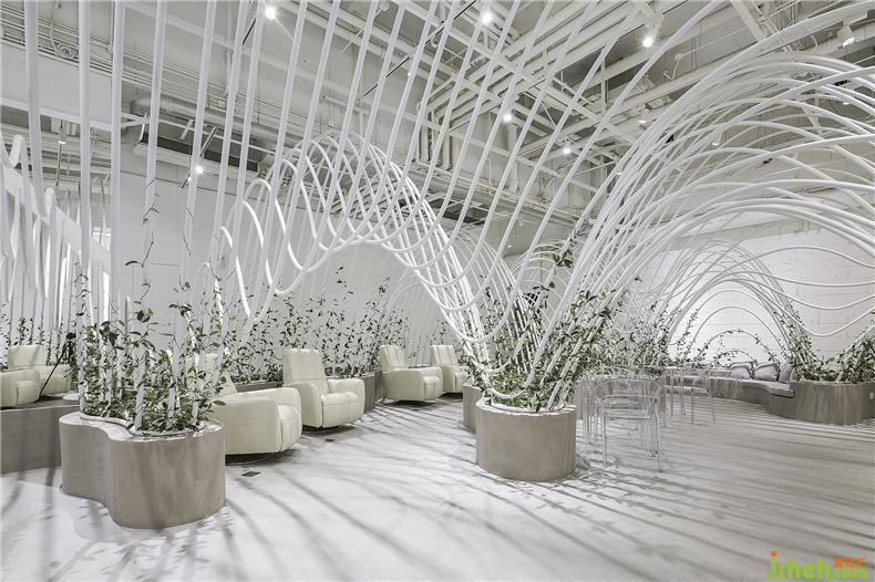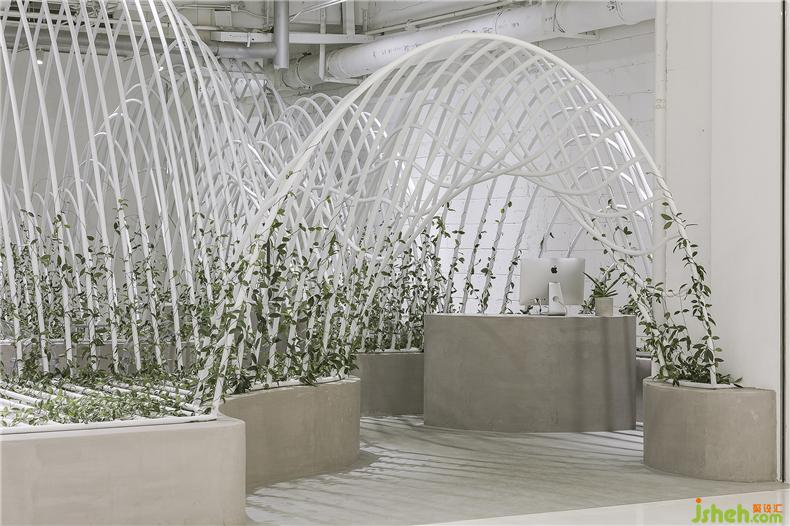設(shè)計首先將整體空間劃分為公共和私密兩部分。室內(nèi)設(shè)計師公共部分為開放植物園。根據(jù)接待、等候、美甲、活動等功能生成10個大小不一的“山丘”,“山丘”互相聯(lián)通形成開放流動的路徑,使用直徑32mm、壁厚3mm的白色鍍鋅鋼管勾勒出連綿起伏的“山丘”輪廓,從地面升起的550mm高水泥臺,將抽象的“山丘”輪廓放置其上,沿水泥臺四周布置爬藤植物,室內(nèi)設(shè)計師綠色的球蘭藤蔓沿著“山丘”的輪廓線生長,生機盎然的提醒著時間和空間的變化。