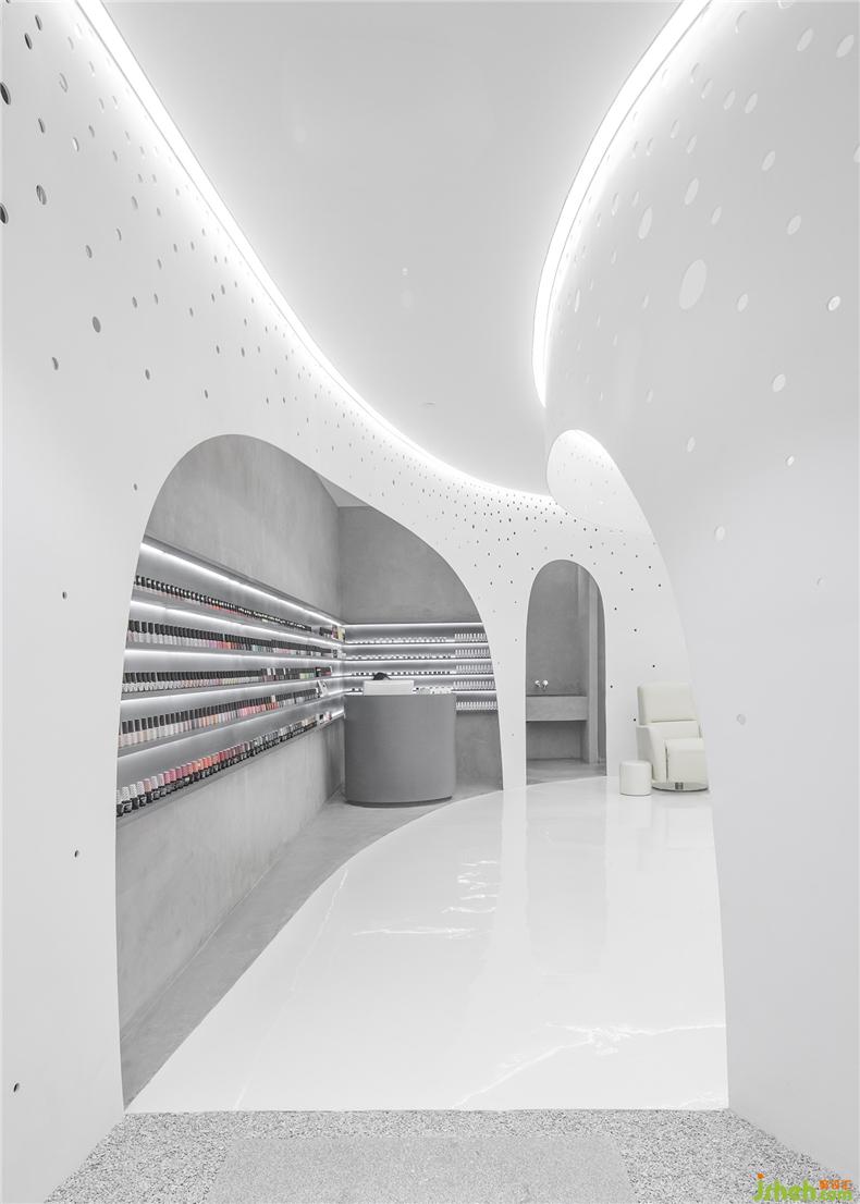 設(shè)計(jì)摒棄了以往該類型店鋪所采用的過(guò)度裝飾的符號(hào)化做法,室內(nèi)設(shè)計(jì)師以營(yíng)造輕松、舒適、自然的環(huán)境體驗(yàn)作為出發(fā)點(diǎn),讓顧客們?cè)谶@里可以放松身心,仿佛置身于一座花園。室內(nèi)設(shè)計(jì)師一圈兒8毫米厚的白色穿孔鋼板從商場(chǎng)走廊逐漸延伸至店鋪內(nèi)部,創(chuàng)造出一個(gè)柔軟、純凈的弧型空間。不同于以往美甲店排座的方式,室內(nèi)設(shè)計(jì)師這里的六個(gè)座位是向心排布的,顧客在美甲的同時(shí)也可以愉快的交流。LED發(fā)光燈膜結(jié)合螺旋鋼板,營(yíng)造出柔和均勻的室內(nèi)光環(huán)境。室內(nèi)設(shè)計(jì)師植物墻作為整個(gè)空間的綠色背景,使新空間富于生機(jī)。螺旋曲線與原有方形店鋪的空隙自然形成了前臺(tái)展示、植物景觀和員工服務(wù)等輔助空間。