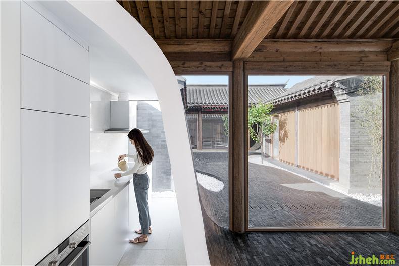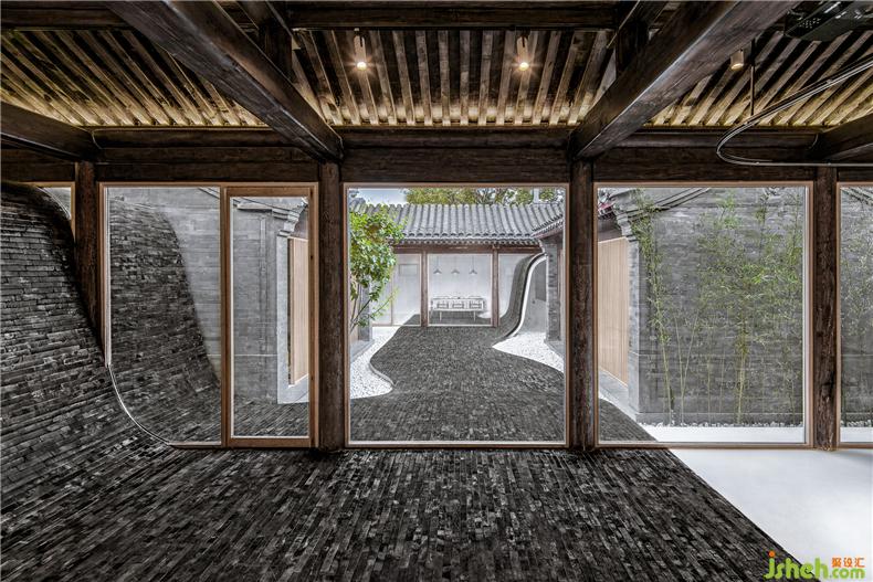 改變原本四合院的莊重、刻板的印象,營造開放、活躍的院落生活氛圍。別墅裝飾基于已有院落格局,利用起伏的地面連接室內(nèi)外高差并延伸至房屋內(nèi)部扭曲成為墻和頂,讓內(nèi)外空間產(chǎn)生新的動態(tài)關聯(lián)。隱于曲墻之內(nèi)的是廚房、衛(wèi)生間、庫房等必要的服務性空間;顯于曲墻之外的會客、餐飲空間與庭院連接成為一個整體。室內(nèi)外地面均采用灰磚鋪就,院中原有的一顆山楂樹也被保留在扭動的景觀之中。