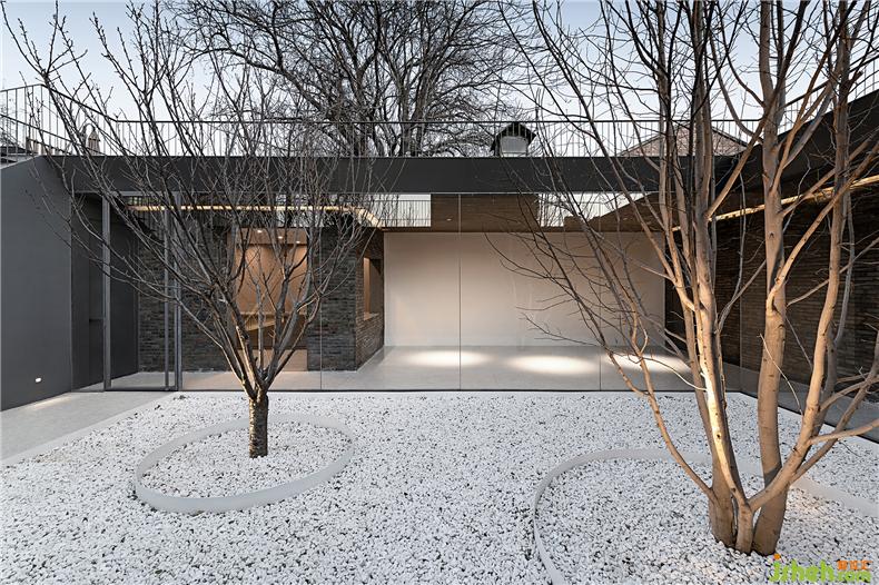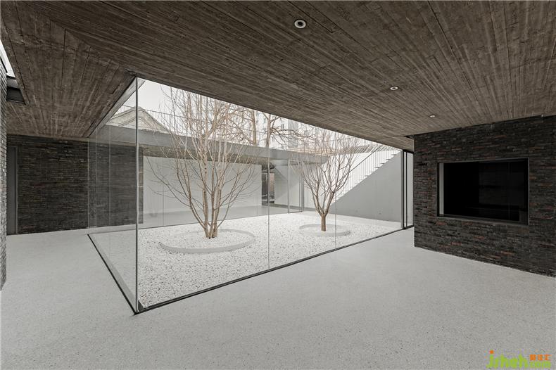 基于平屋頂建筑的特點,設(shè)計在舊有建筑平面格局上添加了連廊和樓梯,別墅裝飾將屋頂與地面、房屋與庭院相互串聯(lián),成為一條可通達(dá)賞玩的折疊循環(huán)路線,讓建筑的內(nèi)與外、上與下、新與舊產(chǎn)生互動關(guān)系。平屋頂是一處在四合院區(qū)域難得的公共活動場地,也是內(nèi)部功能使用的重要延伸,屋頂景觀與周邊復(fù)雜多樣的坡屋頂建筑和樹木形成有趣的對應(yīng)。別墅裝飾圍繞折疊的環(huán)線,由入口向內(nèi)部自然劃分出四個不同尺度的庭院——入口處狹長的竹院;保留原有老槐樹的樹院;清除原來玻璃頂,并置入水景、卵石的水院;以及保留南向與鄰里過渡的后院。因此,在這個空間游走將伴隨著不斷變化的景致。保留原有建筑的兩處磚房子,別墅裝飾并新增三處磚盒子則作為私密空間,功能分別被設(shè)定為休息室、廚房、衛(wèi)生間等。盒子之間構(gòu)成連續(xù)而又分離的公共區(qū)域,可容納辦公、聚會、餐飲等活動。磚盒子墻體內(nèi)部隱藏著屋面的結(jié)構(gòu),設(shè)計有意讓屋面與磚盒子墻面脫開產(chǎn)生天光的縫隙,令二者獨(dú)立并置。項目沿用了四合院常見的舊磚、青瓦、水泥等作為主要材料。屋面均為立砌青瓦鋪裝,青瓦按照屋頂不同方向線性排布,并跟隨樓梯連接到室內(nèi),產(chǎn)生如流水一般的視覺效果。別墅裝飾屋面為現(xiàn)澆混凝土板,室內(nèi)表面保留了木紋模板的自然紋理。磚盒子則是由附近院落拆除的舊磚砌筑的,由墻面延伸到屋頂并形成了休息座椅。