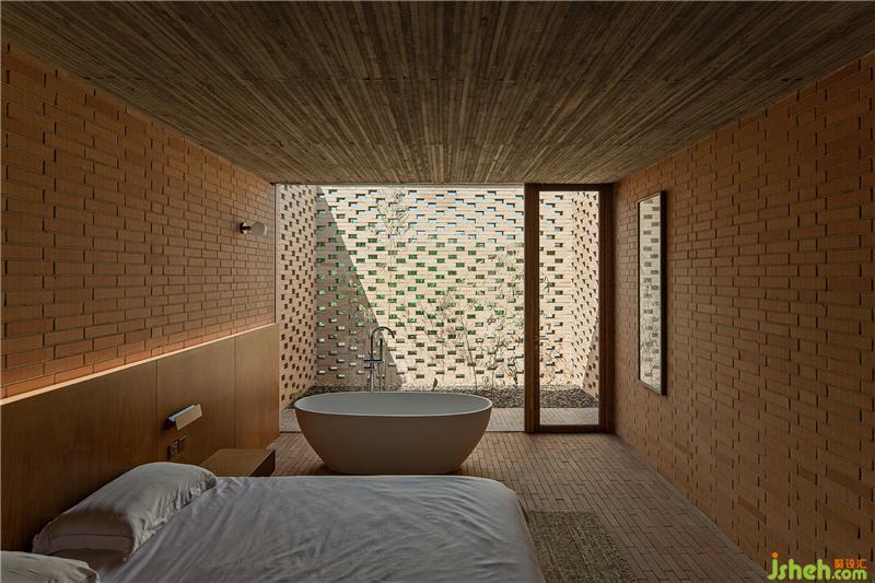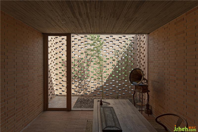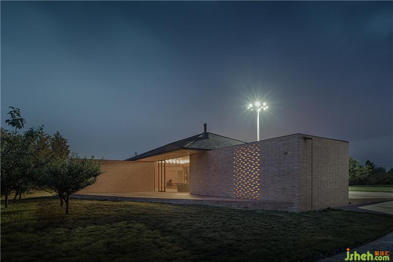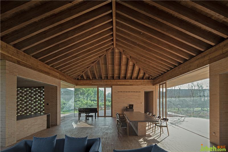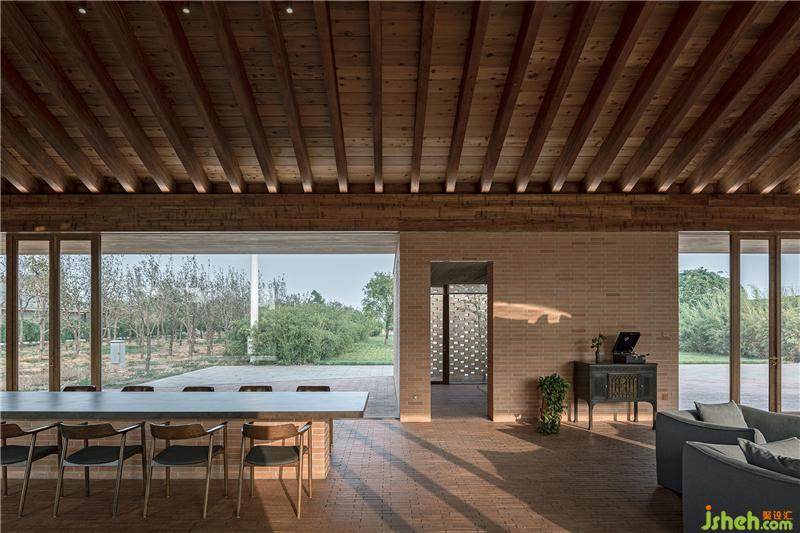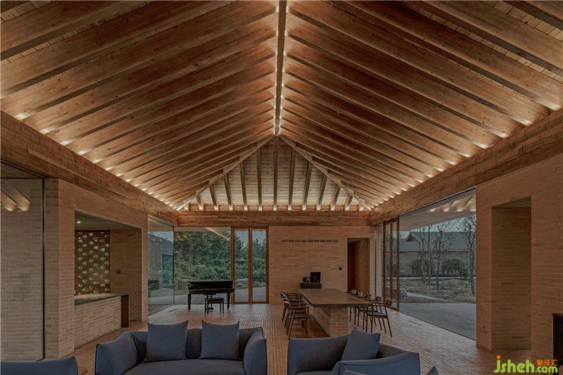 控制空間、結(jié)構(gòu)與材料的邏輯關(guān)系,圍繞鄉(xiāng)村休閑空間的基本特征,呈現(xiàn)物料的本真之美。四間房屋采用鋼框架+混凝土板,現(xiàn)澆木模板混凝土頂板直接顯現(xiàn)于室內(nèi)空間之內(nèi)。墻面使用了一種米黃色頁巖磚。設計利用雙層清水磚墻構(gòu)造,在墻內(nèi)空腔設有保溫層,保證熱工性能的同時,也保持了內(nèi)外一體的磚材料肌理和質(zhì)感,并隱藏結(jié)構(gòu)、空調(diào)等設備管線。唐山別墅裝飾墻面在庭院部分由實磚漸變?yōu)槁┐u,讓房屋內(nèi)外保持著光線和空氣上的流通。室內(nèi)外臺基地面也全部由米黃色磚鋪砌而成。公共空間屋頂采用了木結(jié)構(gòu)密肋梁,屋面覆蓋火燒板屋面瓦。木與磚材料的結(jié)合,共同營造出室內(nèi)空間樸素、溫暖、自然的氛圍,并且由壁爐、餐臺和鋼琴進一步定義了不同公共活動區(qū)域。