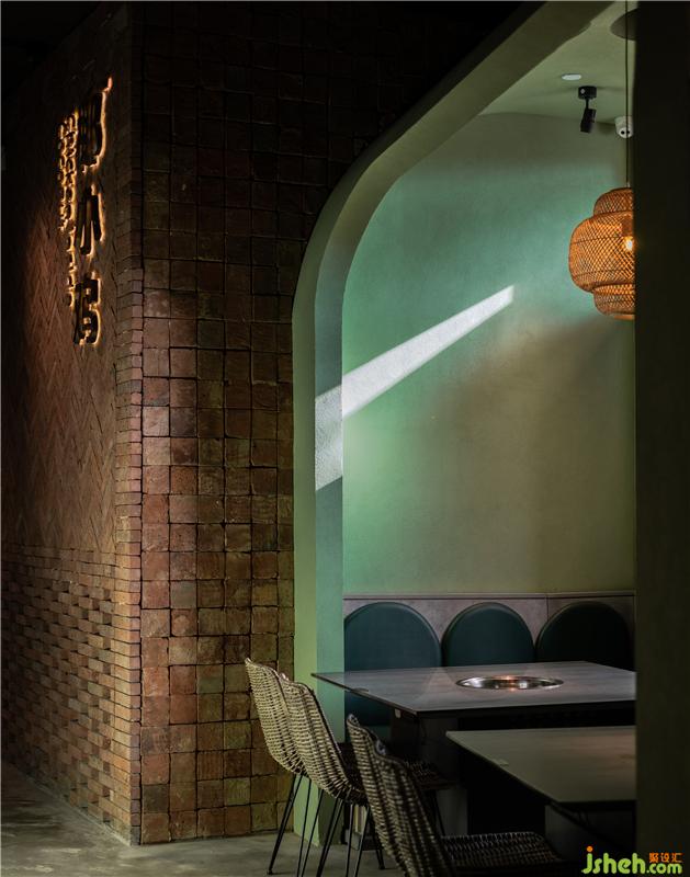 在灰綠色水泥的對(duì)立面,紅磚作為空間另一種主材,形成了有趣的色彩互補(bǔ)和質(zhì)感碰撞,設(shè)計(jì)師將這兩種美學(xué)元素并置在一起,前者體現(xiàn)優(yōu)雅格調(diào),后者則流露出文化沉淀后的底蘊(yùn),而兼顧生活感和藝術(shù)感,也是提升消費(fèi)者品味和凸顯品牌格調(diào)的一種方式。紅磚墻堆砌與拼接的設(shè)計(jì),不只是一道隔斷,傳統(tǒng)的工藝會(huì)賦予它力量感,光線也會(huì)隨著時(shí)間透出神秘的感覺(jué),在實(shí)虛交互之中,人們會(huì)從間隙中滲出詩(shī)意,粗狂但很浪漫。