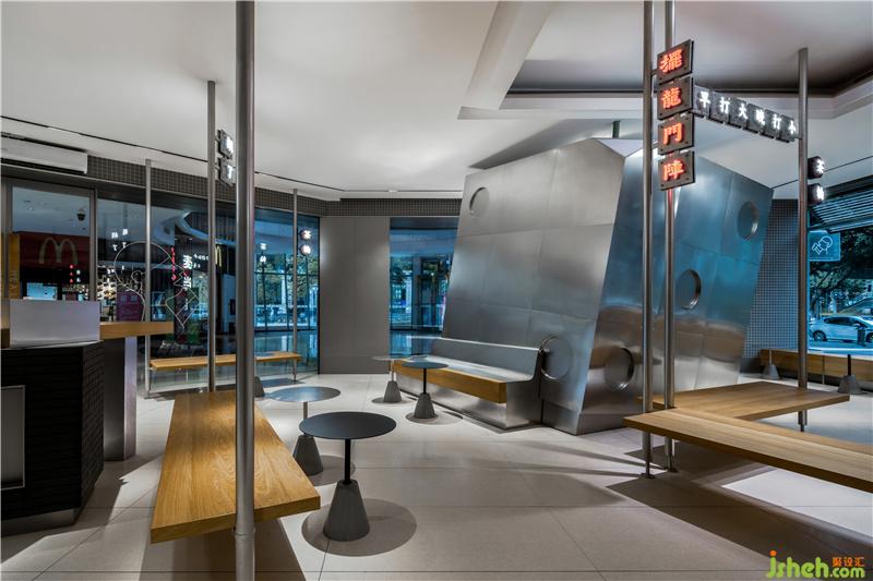 喜茶裝修設(shè)計(jì)的空間由灰色的馬賽克作為基底,不銹鋼骰子裝置、原生竹木條凳與俚語(yǔ)牌構(gòu)成具有年代感與趣味性的畫面。回溯80年代成都街頭、茶館隨處可見(jiàn)的人間煙火——?jiǎng)诼狄惶斓娜藗儑谝黄鸹蜃蛱耍奶煜?、肆意人生?div id="6cydoprw" class="tg_pages">