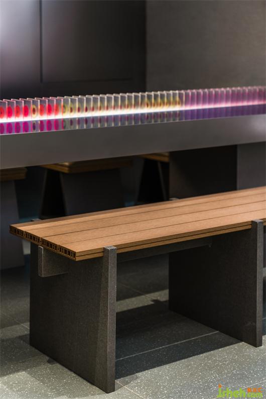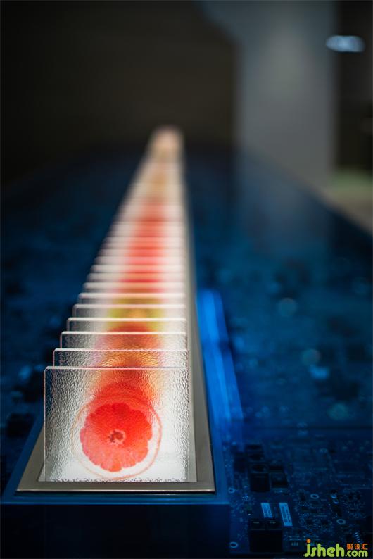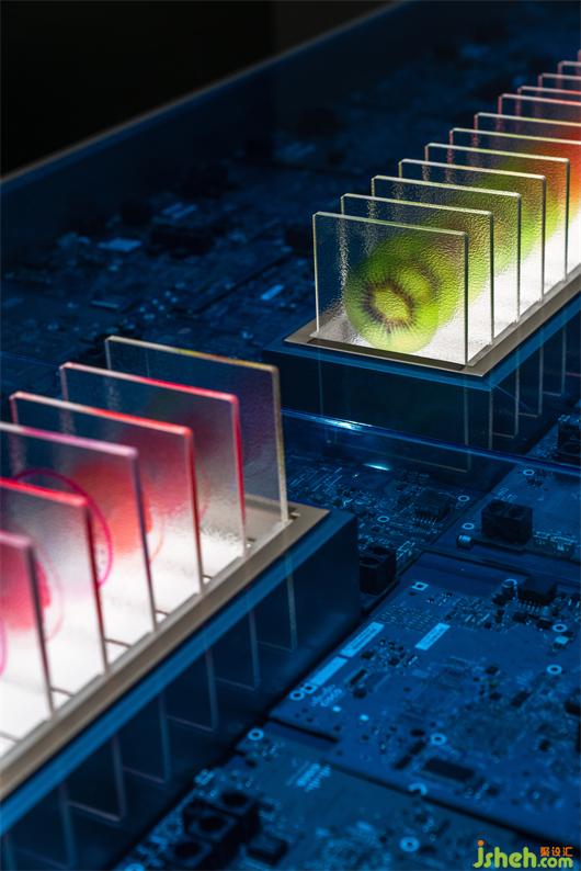 原始冷咧的工業(yè)氣質(zhì),精密整齊的電路板和屏幕上跳動的代碼互相呼應,鮮活的水果切片在透明亞克力里如琥珀般將瞬間化為永恒,不同水果經(jīng)形狀與色彩排列組合,形成延伸與序列感。水果實驗室將“維生素搬運工”的概念可視化,由此探索微觀分子世界,探索時間的現(xiàn)在與未來。
