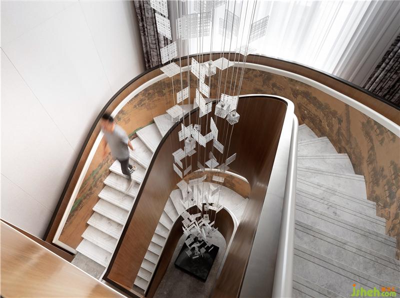 客廳家具選用盧志榮經(jīng)典系列,高級(jí)米咖色系加上藍(lán)綠色藝術(shù)品點(diǎn)綴空間,讓空間簡(jiǎn)潔之余富有美學(xué)張力,旋轉(zhuǎn)樓梯利用石材和木飾面的碰撞用獨(dú)特的手法與工藝相結(jié)合加上起伏的琉璃鶴尾造型藝術(shù)裝置燈,展現(xiàn)出空間靈動(dòng)性和韻律感。背景巨幅山水墨畫彰顯東方韻味的藝術(shù)氣息,點(diǎn)亮整個(gè)空間,又不過(guò)分跳躍。