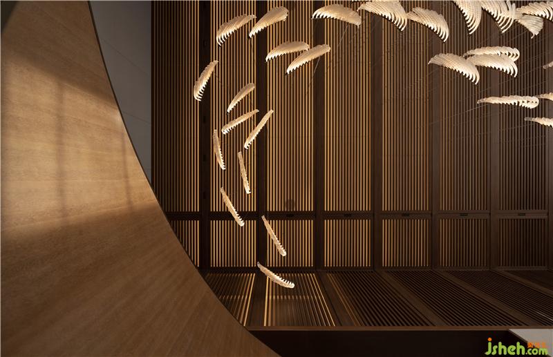 吊頂垂下的鶴尾藝術(shù)燈高低錯(cuò)落,飛鶴盤旋,鴟尾之上。使整個(gè)空間的氣場(chǎng)達(dá)到了一個(gè)高峰,設(shè)計(jì)師想借此表達(dá)主人對(duì)歸隱田園、松鶴延年的向往。