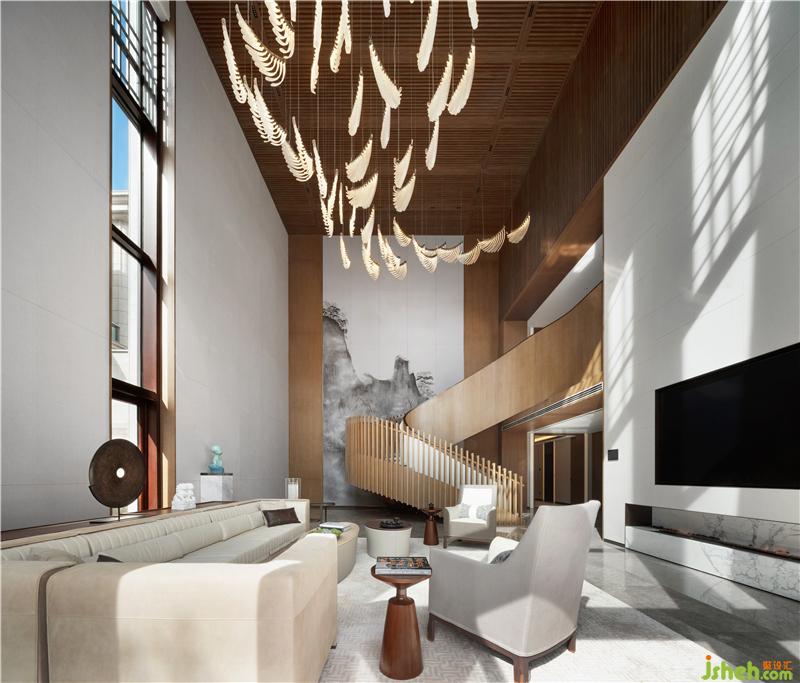 會(huì)客廳空間采用留白的手法, 靈感源自北宋范寬《溪山行旅圖》,主體大畫部分為巍峨高聳的山體,高山仰止,壯氣奪人,寓意寄情山水的寫意生活;挑高的空間帶來(lái)震撼的視覺(jué)感受,會(huì)客廳空間的頂部由細(xì)密的木條覆蓋了整個(gè)天花,體現(xiàn)出傳統(tǒng)的東方建筑風(fēng)格。暖灰調(diào)的石材、深啡色的木作和古銅材質(zhì)形成豐富的色彩和質(zhì)感。頂部垂落的琉璃鶴尾,仿若夏花般絢爛,讓氣氛變得熱烈,氣息變得歡快愉悅。別墅裝飾