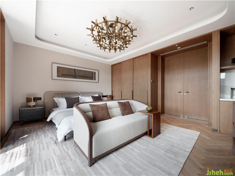 大面積采用了煙熏啞光鐵刀木飾面和素色硬包,簡(jiǎn)約大氣以及中式的留白。使主人在以后的生活閱歷中增添自己喜好的收藏和經(jīng)歷、別有一番情趣。主人房盡顯沉穩(wěn)大氣之勢(shì),整體木色淺灰的色調(diào),當(dāng)中以藍(lán)色為點(diǎn)綴,彰顯干練的同時(shí),又不失寧?kù)o的氛圍,讓主人在繁忙的工作中能夠享受生活。