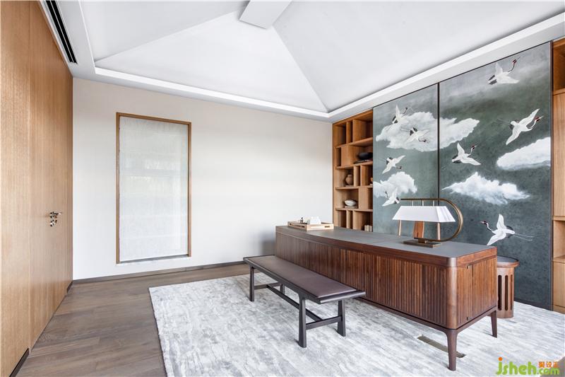 主人愛(ài)書畫收藏,故而書房書柜采用了《瑞鶴圖》作為背景。描繪了鶴群盤旋于宮殿之上的壯觀景象,繪畫技法精妙,圖中群鶴如云似霧,姿態(tài)百變,各具特色?!度瘊Q圖》繪彩云繚繞之汴梁宣德門,上空飛鶴盤旋,鴟尾之上,有兩鶴駐立,互相呼應(yīng)。畫面僅見(jiàn)宮門脊梁部分,突出群鶴翔集,莊嚴(yán)肅穆中透出神秘吉祥之氣氛。