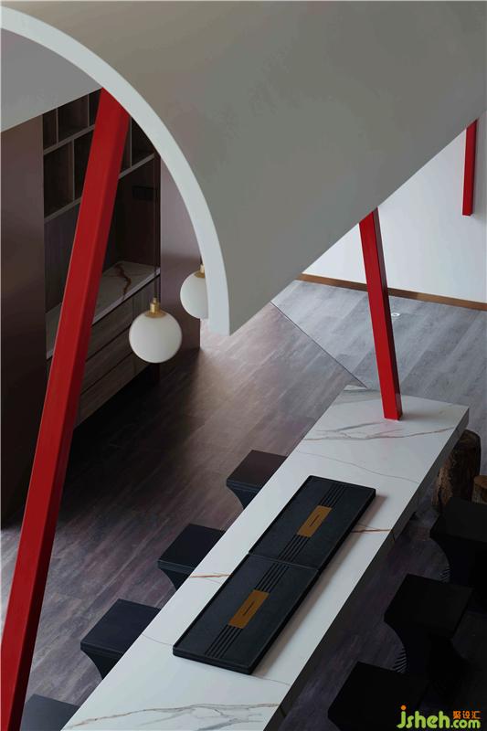 輕松的基調(diào),在刻意打造的沙龍場域中蔓延,試想我們可以在此進(jìn)行不只是公事上的一切日?;顒?,而你我皆受邀其中。林彥認(rèn)為設(shè)計的底色是【突破限制】,因此讓兩根方管去撐起一整塊實心大理石,石料在沒有“下地”的日子里,將承載多個重要“角色”這是【技術(shù)與藝術(shù)】的結(jié)晶,亦是【竹?!繉τ跇O致態(tài)度的前導(dǎo)語言。
