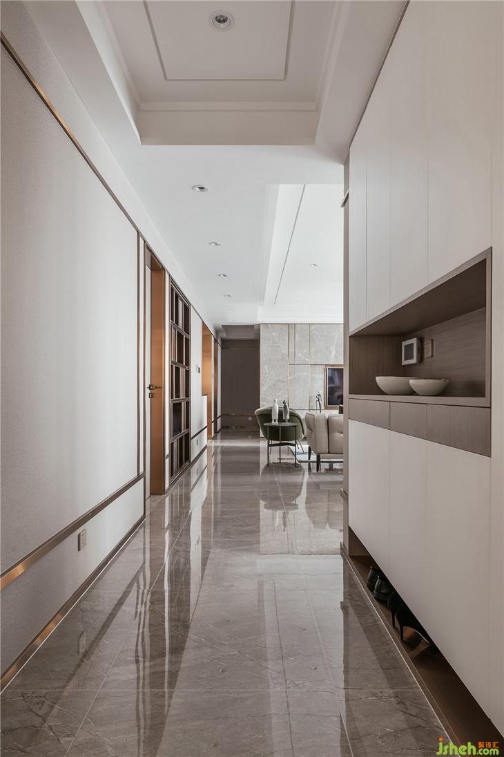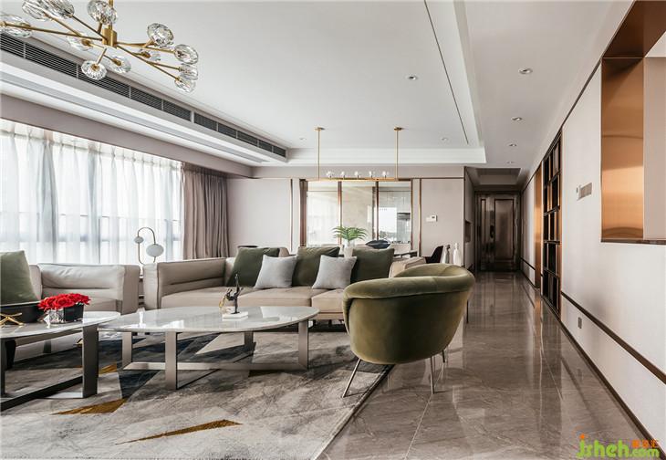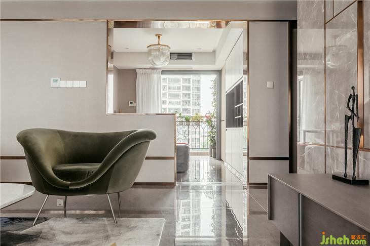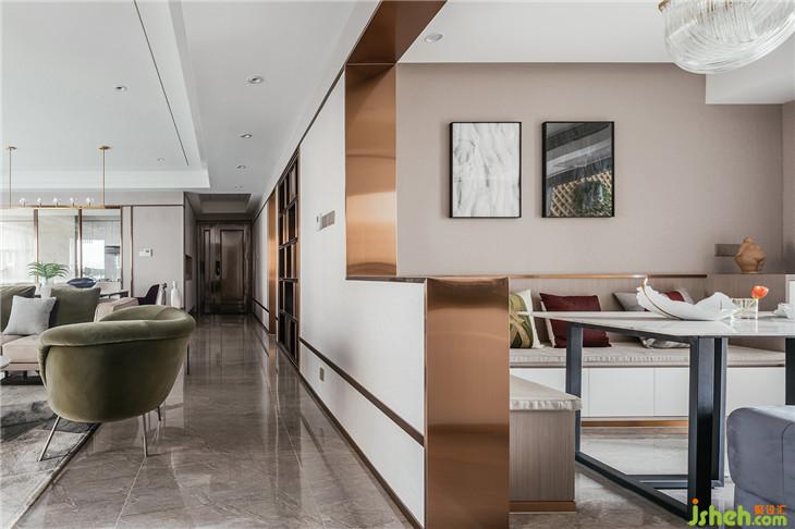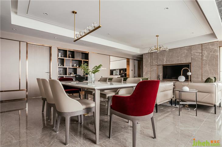 原始戶(hù)型優(yōu)點(diǎn)和缺點(diǎn)同樣明顯,客廳餐廳不分區(qū)視野大,四面開(kāi)窗開(kāi)門(mén)采光好,但每面墻都不對(duì)稱(chēng)且不完整。硬裝設(shè)計(jì)以電視墻與吊頂為中心建立中軸對(duì)稱(chēng)關(guān)系,以金屬裝飾線條建立延伸圍合關(guān)系,取消小陽(yáng)臺(tái)擴(kuò)大廚房空間,全房?jī)H保留兩個(gè)臥室套間和一個(gè)客房兼儲(chǔ)物室。圍繞男主人的喜好和女主人的需求,空間設(shè)計(jì)緊扣現(xiàn)代簡(jiǎn)約+雅奢時(shí)尚的調(diào)性進(jìn)行多向發(fā)揮,整體搭配以米金咖作為主基調(diào),背景色基本為米咖色,陳設(shè)主色較之更深濁一層,配色加入不同色相的紅與綠,點(diǎn)綴黑白灰平衡視覺(jué)。