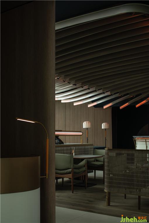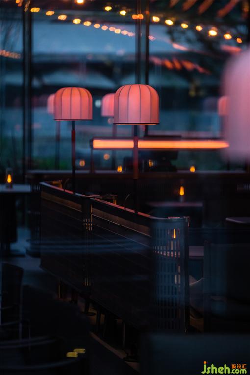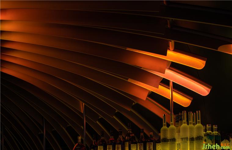 一層的酒吧是著重構(gòu)想的區(qū)域,我們希望這里是一個可以放飛自我,潮流匯聚的地方,同時,也希望能在整個交子大道上出現(xiàn)一個特別又便于記憶的元素。我們將大天使之翼設(shè)計進來,并將整個二層樓板托起,餐廳設(shè)計使其成為整個空間里內(nèi)外視覺的焦點,并通過特別設(shè)計的照明方式,讓整個翅膀如驚鴻般閃動變化,酒吧的多元變幻和張力將更加明顯。