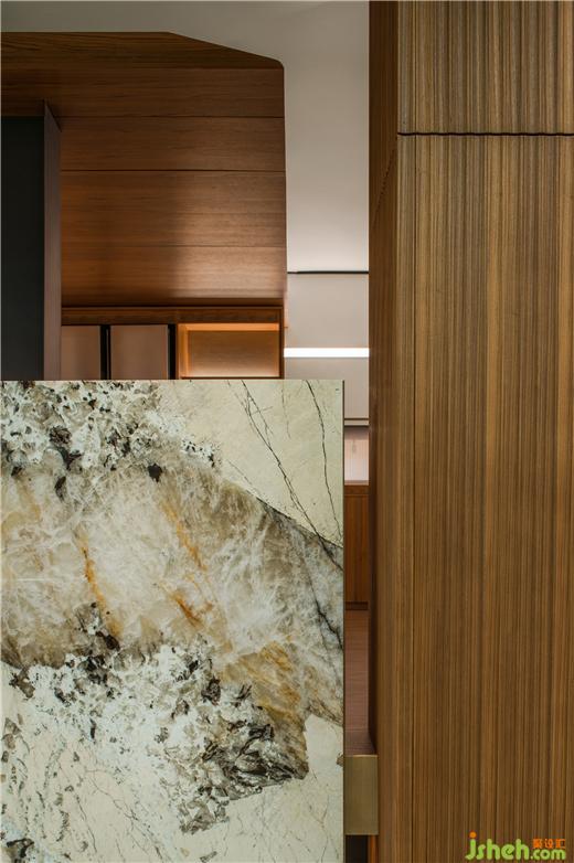 在入口處,展廳設(shè)計師用自然的石階、乳白色的人造石、白色架空的Logo墻和帶有花紋的石材結(jié)合,讓進(jìn)入通道漂浮起來。