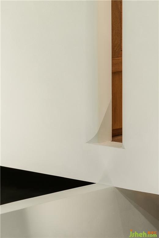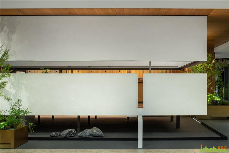 在這里,展廳設計師恰如其分地引入室內(nèi)園林的元素,點綴的頑石在架空層邊緣,與植物枝影成為界定空間邊緣的元素,生氣怡然。橫貫盒子中上部的長窗的高度被設計師精心設計,成為視線遮蔽與開啟的重點。這樣,接待與方案討論被共享和自然分區(qū),互為可交流的風景。