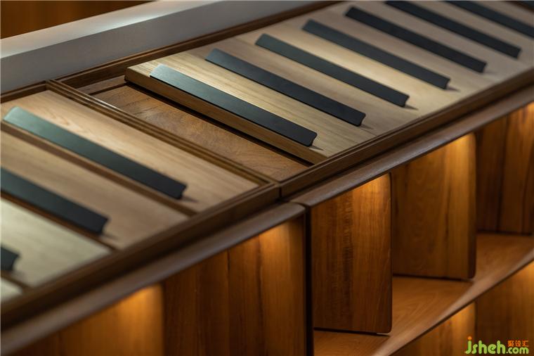在與人交往的區(qū)域,是設計師最費心的地方,稍不留意,將會導致空間節(jié)奏變得混亂。展廳設計師經(jīng)過仔細思慮和空間配比并與品牌方進行充分溝通后,在產(chǎn)品展示區(qū)域的結(jié)尾處,用通透柜體結(jié)構(gòu)作為空間的段落語句,這樣,區(qū)隔變得柔性和相互可以穿插,并用不同照度的光線塑形,使進一步交往因此變得自然。