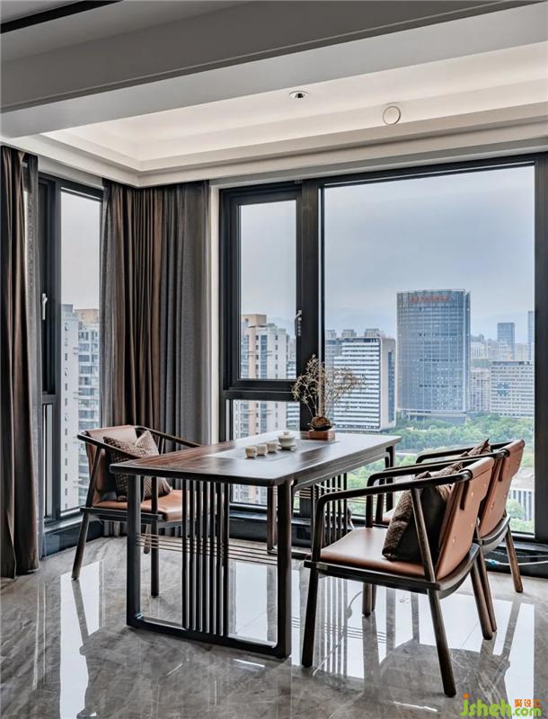泡茶區(qū)與室外景色的糅合相襯,龍巖私宅設計茶具與雅澹的小品點綴其中,令人在東方的韻味中找尋更多現代生活的雅趣。溫一壺茶,清冽甘如飴;茶濃配上餅香,生活的樣子,細膩而溫柔。