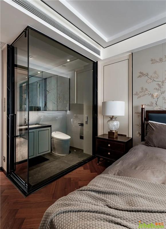 步入次臥,龍巖私宅設計床頭背景墻上,一幅梅花營造靜中之境,剔除瑣碎的裝飾,與特殊定制的床頭與邊柜形成呼應,簡潔的形式、柔和的線條,清寂的裝飾,不同材質與肌理的碰撞,讓人不覺漫游在傳統與現代交織的藝術世界。